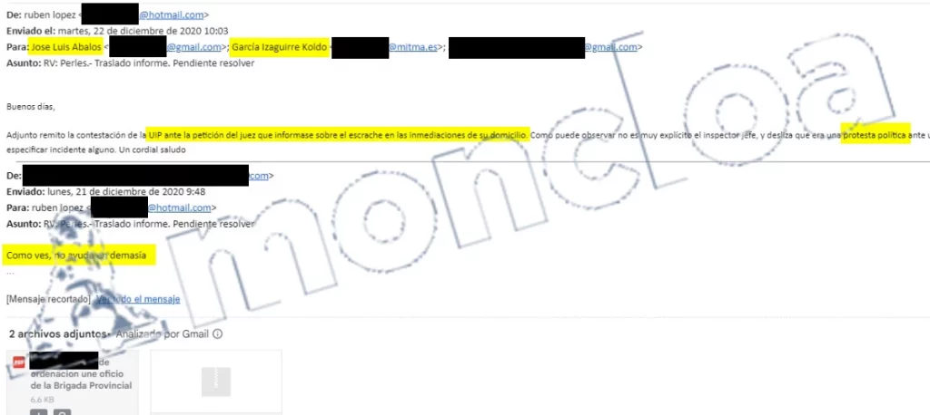 Rubén Eladio López pidió información al jefe de la Unidad de Intervención Policial (UIP) que intervino en ese escrache a Perles, aunque luego se quejaba en otro mail de que «el inspector jefe no es muy explícito y se refiere a una protesta política» y valoraba que «como ves, no ayuda en demasía».