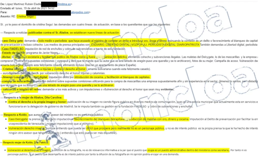 Ese día de abril de 2021 López respondía con el asunto «Cristina Seguí», una conocida abogada y periodista valenciana, a un mail anterior del abogado: «Sí, yo te paso el domicilio de Cristina Seguí. Las demandas son cuatro líneas de actuación, en base a los querellantes (Ábalos, García, Perles y Uriz) que son los siguientes». No explicaba López cómo pretendía conseguir el domicilio particular o profesional de Seguí.
