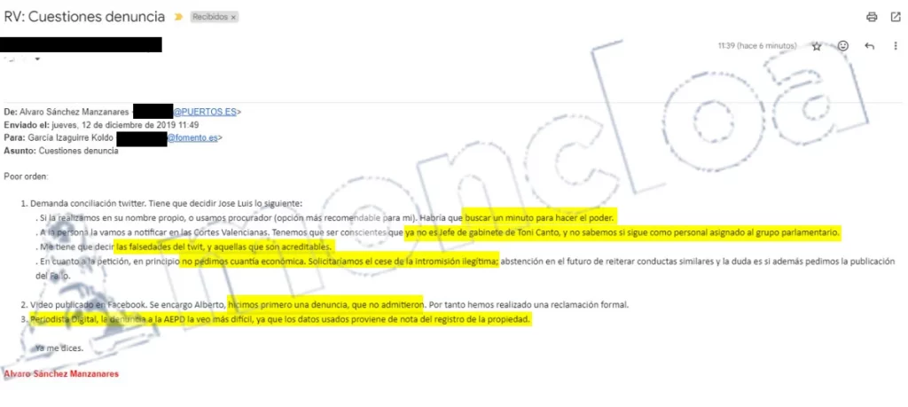 También pidieron consejo a Álvaro Sánchez Manzanares, entonces en la asesoría jurídica de Puertos del Estado que explicaba desde su cuenta corporativa cómo hacer llegar esa denuncia a buen puerto. En concreto, contra el entonces tuitero Alvise Pérez. Actualmente Álvaro Sánchez fue destituido de su cargo como secretario general de Puertos del Estado tras conocerse que era investigado en la trama Koldo de compra de mascarillas,