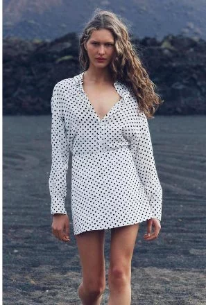 Puedes combinar esta falda mini con una Camiseta estampada de lunares de Zara con un cuello de solapa, manga larga y cierre frontal con botones. Tiene un precio del 30% de descuento, sólo pagarás 15,99 Euros y será más fácil encontrarla con su número de referencia: 8741/277. Dependiendo de tus medidas, puedes elegir entre estas tallas: XS, S, M, L y XL.