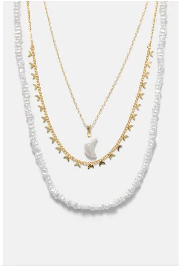 El Pack de 3 collares de luna de Pull&Bear tienen un efecto perla en acabado metalizado en tono dorado con cierre de mosquetón. Un accesorio demasiado sofisticado y le dará a tu cuello un toque muy glamuroso. Está compuesto de 90% latón – 5% zinc – 5% hierro.