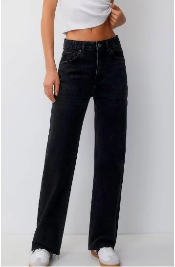 Por otro lado, se encuentran los Jeans rectos tiro alto de Pull&Bear con diseño de cinco bolsillos, cintura con trabillas, cierre de botón y cremallera y confeccionados en 100% algodón. Tiene un súper precio de 12,99 Euros y lo encontrarás fácilmente con su número de referencia: 7686340. Dependiendo de tus medidas, puedes elegir entre estas tallas: 32, 34, 36, 38, 40, 42, 44 y 46.