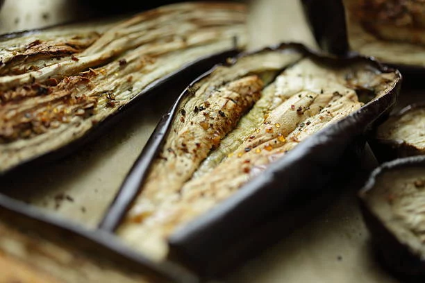 El proceso de preparación comienza cortando las berenjenas a lo largo y realizando unos cortes en forma de espiga o diamante en la carne, sin llegar a cortar la piel. Luego, se sazona y se riega con un chorro de aceite de oliva antes de colocarlas bocabajo en una bandeja con papel de horno. Las berenjenas se hornean a 220º C durante 30 minutos, permitiendo que se cocinen de manera uniforme y adquieran una textura tierna y jugosa, lista para ser rellenada.