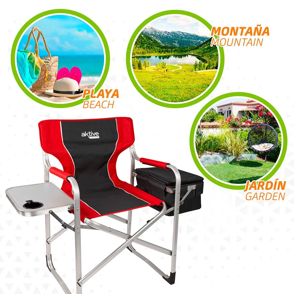 Se trata de la silla camping director c/mesa y bolsa térmica Aktive que se vende Decathlon. Esta silla de camping es muy cómoda, y hasta puede ser su mesa y nevera portátil, todo en uno. Este producto tiene un acabado elegante que se combina con una gran estabilidad, confort y un control muy sencillo. Cabe destacar que en un lado de la silla se encuentra una útil mesa que se puede desplegar para tener a mano los aperitivos.