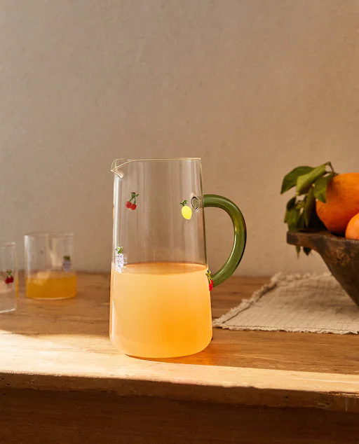 La primera que nos encanta es esta jarra de vidrio con dibujo de frutas en relieve con la que seguro sorprenderás a tus amigos y familiares en verano. Una jarra perfecta para servir una limonada o una sangría fresquita con estilo. En la web de Zara Home se puede encontrar esta jarra dibujo frutas a un precio de 25,99 euros. Cuenta con unas medidas de 21 cm de altura, 11.5 cm de ancho y 21 cm de fondo. Apto para microondas y lavavajillas.
