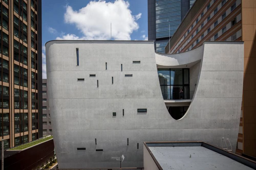Este experto propuso la construcción de este edificio moderno con la intención de terminar con el problema poblacional de la ciudad. Se trata de un espacio de volumen redondo y alto, con bordes suavemente curvados, que se desplanta sobre una base cónica. La fachada de concreto blanco no cuenta con ningún elemento que haga suponer a los turistas que visitan Japón que se trata de un cementerio. Solo son visibles algunas perforaciones redondas y rectangulares. Este cementerio parece flotar en un contexto urbano de edificios de oficinas y gran actividad.