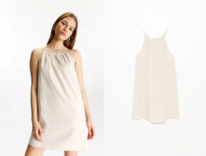 El preferido de esta temporada es el vestido blanco corto de tirantes de Lefties. Esta prenda tiene un diseño sencillo y sofisticado que permitirá aparentar tener unos centímetros de más y que cuesta sólo 10 euros. El diseño simple pero elegante le da a este vestido una cualidad única que lo hizo el elegido por muchos en este verano. Cuenta con cuello redondo y frunce en el mismo. Tiene corte holgado y está confeccionado en un tejido 100% de algodón.
