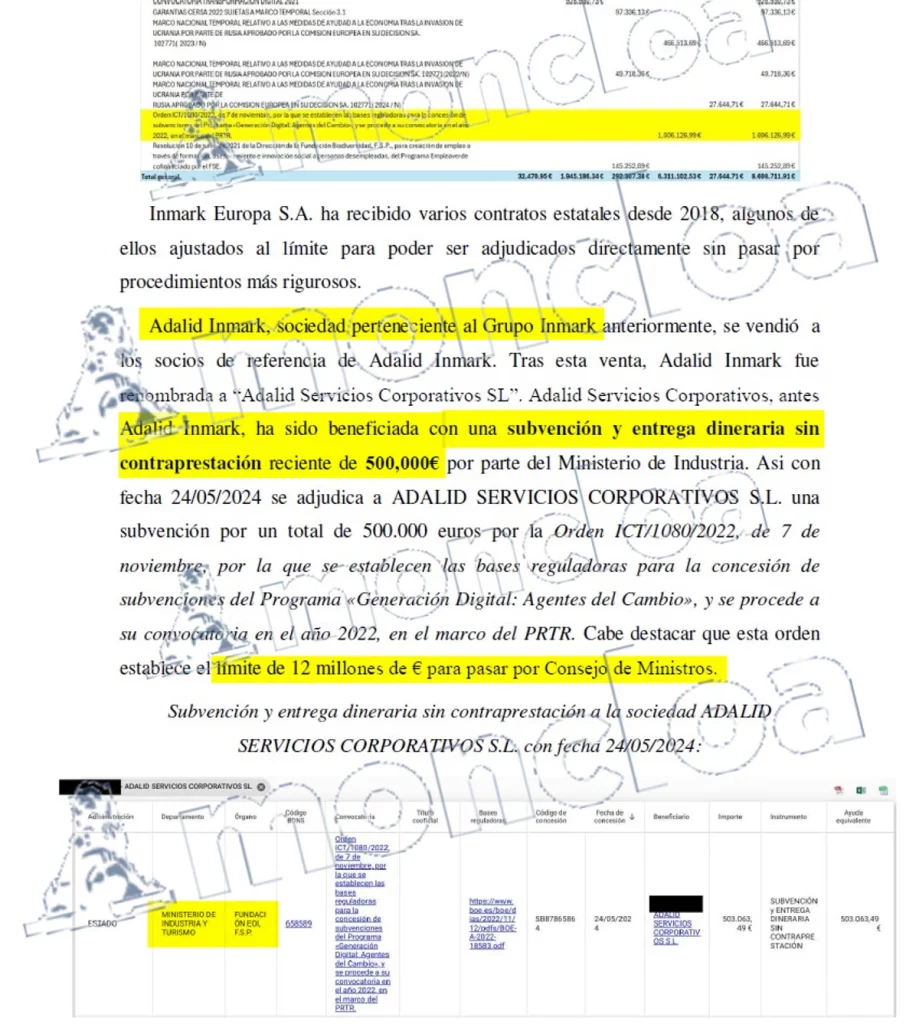 Esta última empresa, Adalid Servicios Corporativos «ha sido beneficiada con una subvención y entrega dineraria sin contraprestación reciente de 500.000 euros por parte del Ministerio de Industria. Así con fecha 24/05/2024 se adjudica a Adalid Servicios Corporativos una subvención por un total de 500.000 euros por la Orden ICT/1080/2022, de 7 de noviembre, por la que se establecen las bases reguladoras para la concesión de subvenciones del Programa «Generación Digital: Agentes del Cambio», y se procede a su convocatoria en el año 2022, en el marco del PRTR. Cabe destacar que esta orden establece el límite de 12 millones de euros para pasar por el Consejo de Ministros», recoge la ampliación de la querella contra Begoña Gómez.