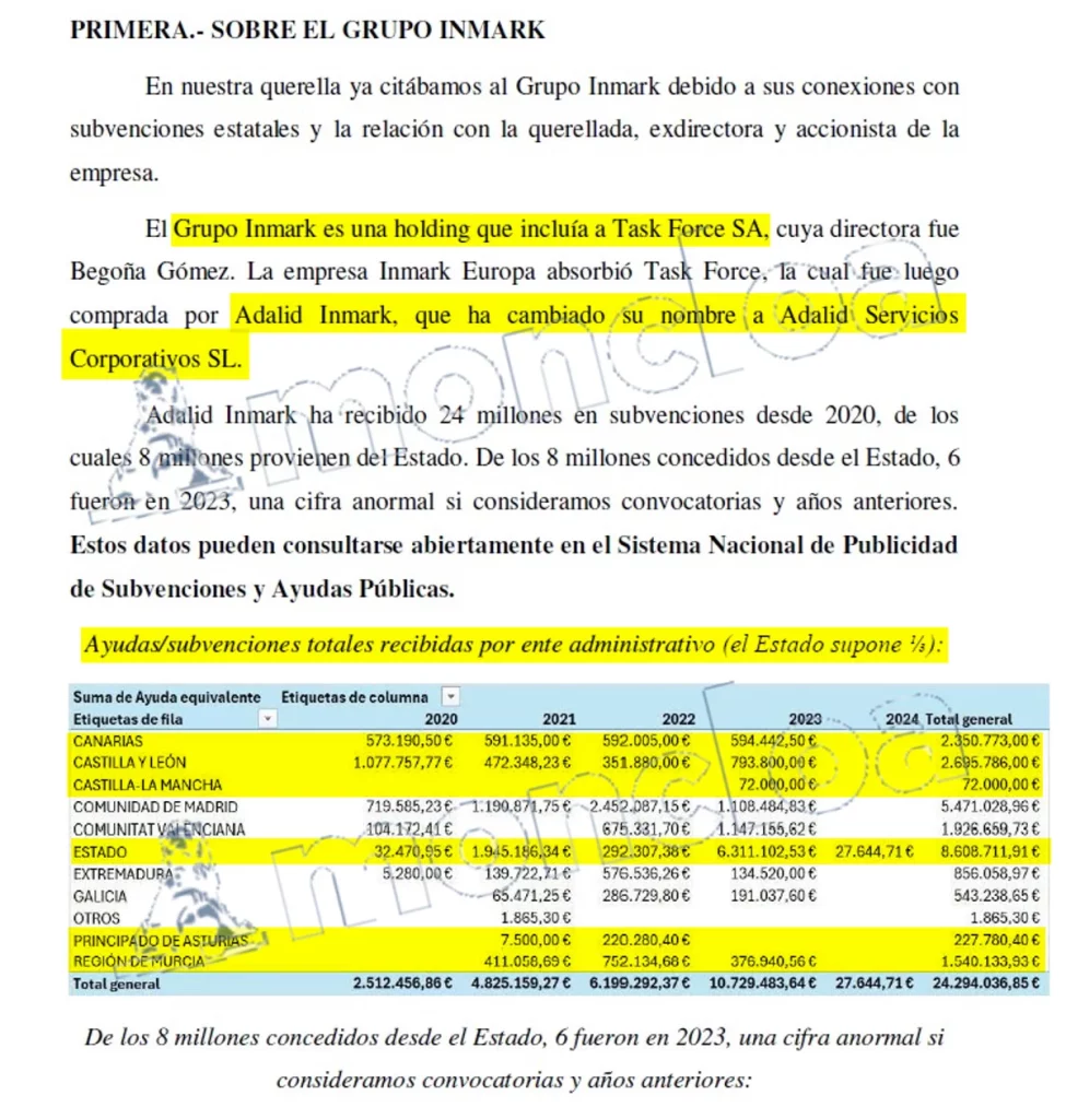 Según los querellantes, el grupo Inmark es «un holding que incluía a Task Force S.A., cuya directora fue Begoña Gómez. La empresa Inmark Europa absorbió Task Force, la cual fue luego comprada por Adalid Inmark, que ha cambiado su nombre a Adalid Servicios Corporativos S.L.», añade el citado escrito. Es precisamente Inmark Europa, según ha podido comprobar MONCLOA, la empresa que recibió hasta dos contratos de la presidencia de ADIF (Administrador de Infraestructuras Ferroviarias), un organismo dependiente del Ministerio de Transportes, Movilidad y Agenda Urbana (MITMA), antes dirigido por José Luis Ábalos y también salpicado por el Caso Mascarillas.