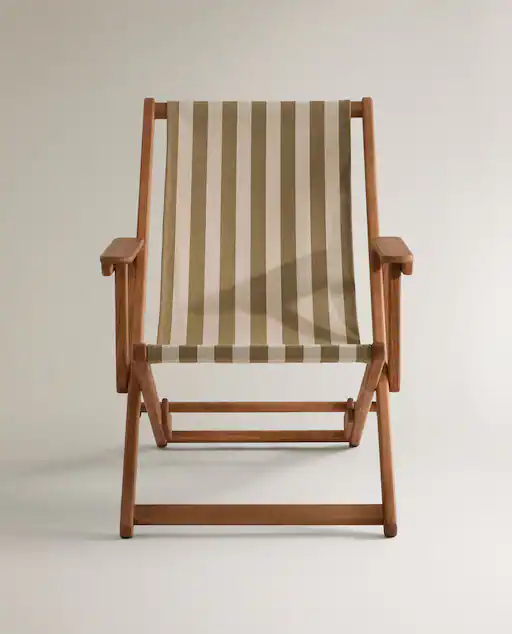 El primer mueble en el que nos hemos fijado en Zara es en esta silla tumbona de madera de fresno con tejido de algodón a rayas. Una cómoda y práctica tumbona que tiene dos posiciones de inclinación en el respaldo y en los reposabrazos. Como es plegable se puede guardar en cualquier lugar sin ocupar espacio. Esta práctica silla tumbona plegable que se puede colocar en cualquier lugar de la terraza o el jardín se puede encontrar en la web de Zara Home a un precio de 126 euros.