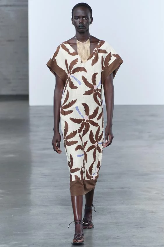 El primero que hemos elegido es este vestido estilo kaftán de escote pico con entredoses y pasamanería. Cuenta con manga larga ancha y bajo con aberturas. Este vestido Kaftán cuenta con un 48% de algodón, 48% de viscosa, 3% de poliéster y 1% poliamida. Esta original prenda se puede encontrar en la web de Zara en tallas de XS-S a la M-L y a un precio de 39,95 euros.