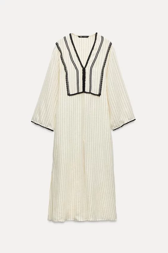 El primero que hemos elegido es este vestido estilo kaftán de escote pico con entredoses y pasamanería. Cuenta con manga larga ancha y bajo con aberturas. Este vestido Kaftán cuenta con un 48% de algodón, 48% de viscosa, 3% de poliéster y 1% poliamida. Esta original prenda se puede encontrar en la web de Zara en tallas de XS-S a la M-L y a un precio de 39,95 euros.
