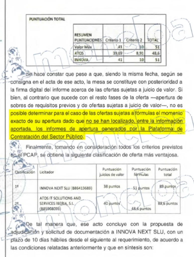 En el último informe de la Benemérita de 2 de julio de 2024 los investigadores refieren que «no es posible determinar para el caso de las ofertas sujetas a fórmulas el momento exacto de su apertura, dado que no se han localizado, entre la información aportada, los informes de apertura generados por la Plataforma de Contratación del Sector Público« y continúa dando como consecuencia que «ese acto concluye con la propuesta de adjudicación y solicitud de documentación a Innova Next SLU, con un plazo de 10 días hábiles desde el siguiente al requerimiento, de acuerdo a las condiciones relatadas anteriormente». Esas condiciones eran 3.044.890,50€ más 639.427,01€ en concepto de IVA. En total, 3.684.317,51€.