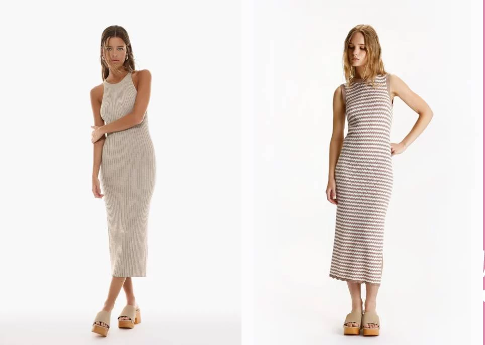 Una de las alternativas de Lefties es el vestido de punto. Este diseño se encuentra en venta en la tienda online a 16 euros y es uno de los ítems de la temporada. Se trata del diseño de canalé beige con corte midi y cuello halter que resulta ideal con tacones para la noche o zapatos planos durante el día. En otoño, esta prenda también queda bien con zapatillas o botas y una chaqueta para las noches frescas.