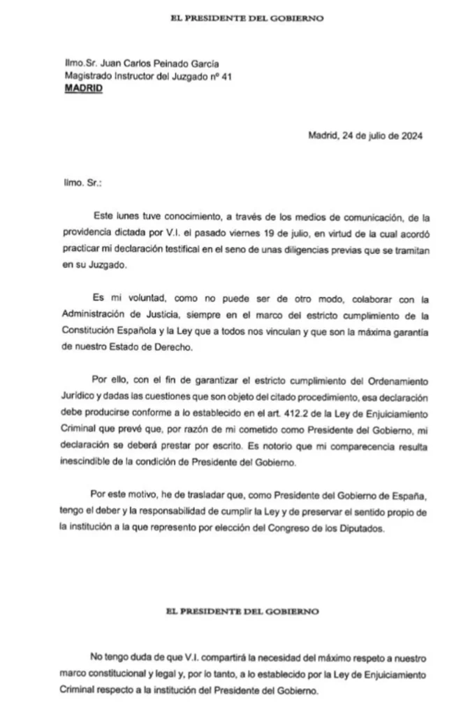El presidente del Gobierno, Pedro Sánchez, envió el pasado 24 de julio una carta al juez que investiga a su esposa, Begoña Gómez, por presuntos delitos de tráfico de influencias y corrupción en los negocios, en la que asegura que tiene voluntad de «colaborar» con la Justicia, pero defendía que su declaración como testigo el 30 de julio «se deberá prestar por escrito». Alega que su declaración se enmarca en su condición de presidente y que por ello debe ser por escrito.