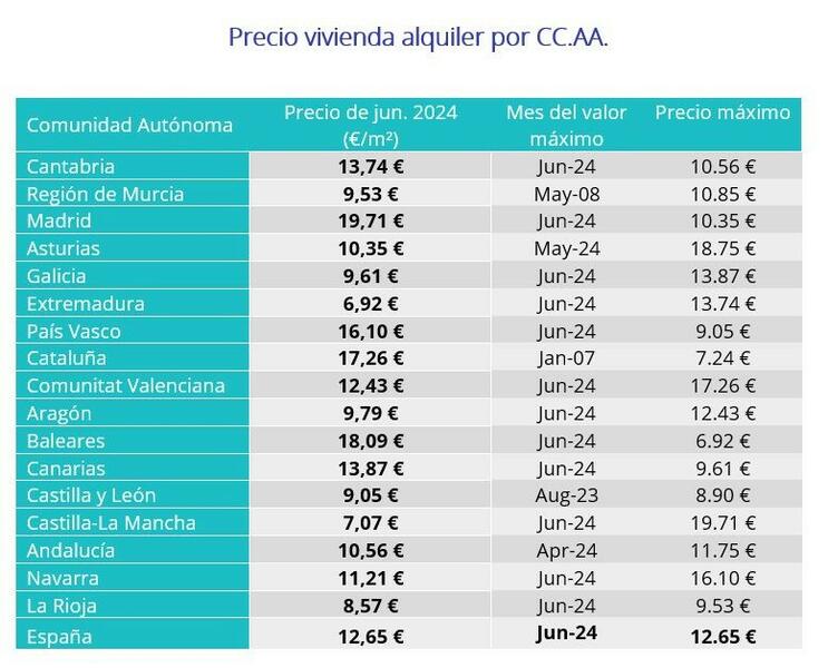Durante la primera mitad de este año, las comunidades de Andalucía, Asturias, Baleares, Canarias, Cantabria, Castilla y León, Cataluña, Comunidad Valenciana, Extremadura, Galicia, Madrid, Navarra, País Vasco y Murcia han alcanzado su precio máximo en el mercado del alquiler. Por su parte, La Rioja llegó a máximos en agosto de 2023.