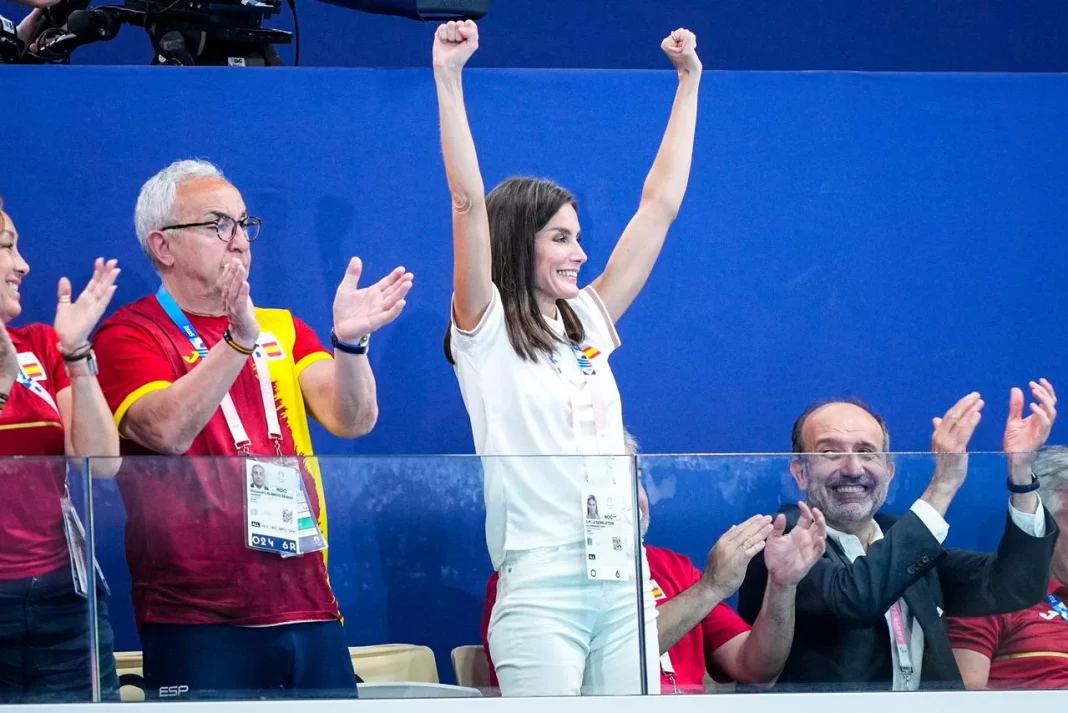 La reina Letizia, vestida con el polo blanco de la firma Joma, diseñado para el equipo olímpico español, siguió el partido desde las gradas del Centro Acuático de Saint Denis, mostrando gran entusiasmo y conversando animadamente con José Manuel Uribes, presidente del Consejo Superior de Deportes.