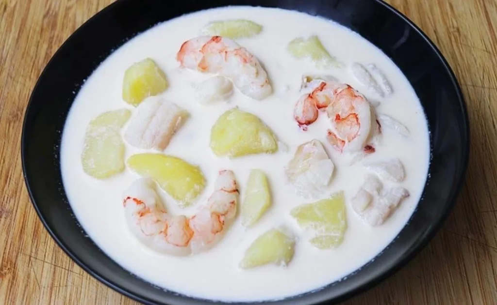 Una vez que el caldo esté listo, se cuela y se reserva. Las patatas y el pescado se mezclan en trozos pequeños. Paralelamente, se prepara una mayonesa casera con huevo, aceite de oliva virgen extra y limón. La clave aquí es ir añadiendo el caldo de pescado poco a poco a la mayonesa, removiendo constantemente para evitar que se corte.