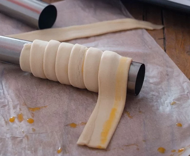 Para crear los moldes de los canutillos, debes utilizar los tubos de metal. Enrolla cada tira de hojaldre alrededor del tubo, superponiendo ligeramente los bordes para asegurar que se adhieran bien durante el horneado. Coloca los tubos en una bandeja de horno forrada con papel de hornear y hornea a 200°C durante 15-20 minutos, o hasta que estén dorados y crujientes. Deja enfriar los canutillos antes de desmoldarlos con cuidado.