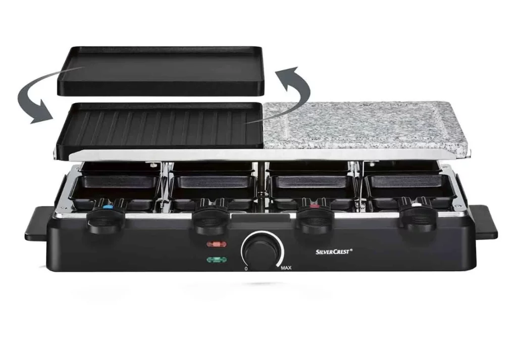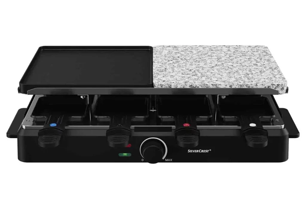 La parrilla raclette de Lidl no solo destaca por su precio accesible, sino también por sus características innovadoras. Con una potencia de 1400 W, este aparato incluye una placa de piedra natural y una placa grill de doble cara, ambas diseñadas para ofrecer una cocción precisa y deliciosa de una variedad de alimentos, desde verduras hasta carnes y pescados.