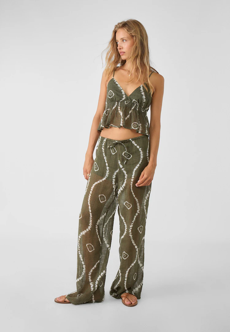 Los pantalones lisos o estampados siempre están de moda y son una buena opción para estos últimos días de verano. Los pantalones estampados se pueden combinar con camisetas de tirantes o con manga corta, tops cortos y blusas de manga larga o corta. Los pantalones estampados quedan bien a las mujeres cuando están bronceadas y también a las que son delgadas, con curvas o las que tienen piernas largas. Además de estos pantalones también se pueden encontrar en las tiendas físicas y las webs de Berska, Stradivarius y Zara otros modelos de pantalones estampados con los que disfrutar con comodidad del final del verano.