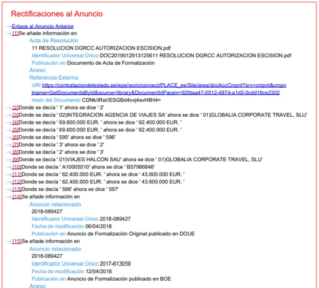 En la rectificación del 29 de enero de 2019 se corrigieron hasta 18 apartados del contrato. Entre estos errores, se llegó a modificar el acta del contrato por carecer de datos clave en una adjudicación pública, como la resolución de la DGRCC para la autorización; el identificador Universal Único ‘DOC2019012913125611’ con la resolución; la publicación en documento del acta de formalización y un anexo. Además, también se tuvo que añadir la referencia externa en la plataforma de contratación; y hasta el ‘hash’ -identificador único para cada licitación- del documento.