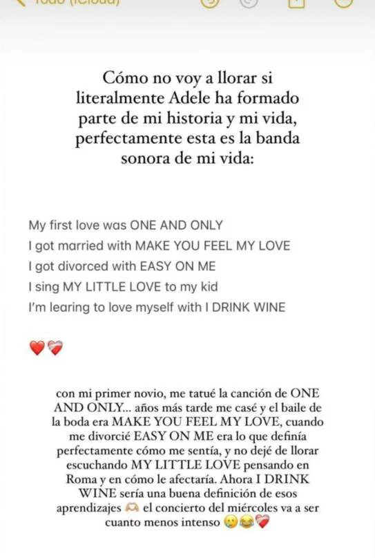 Laura ha citado particularmente “My Little Love” como una canción que la ha conmovido profundamente, evocando sus sentimientos hacia su hija Roma y cómo el divorcio ha afectado su vida familiar. Ahora, “I Drink Wine” se ha convertido en un himno que sintetiza sus aprendizajes y sentimientos recientes. En sus palabras, el próximo concierto de Adele será un evento cargado de emociones intensas.