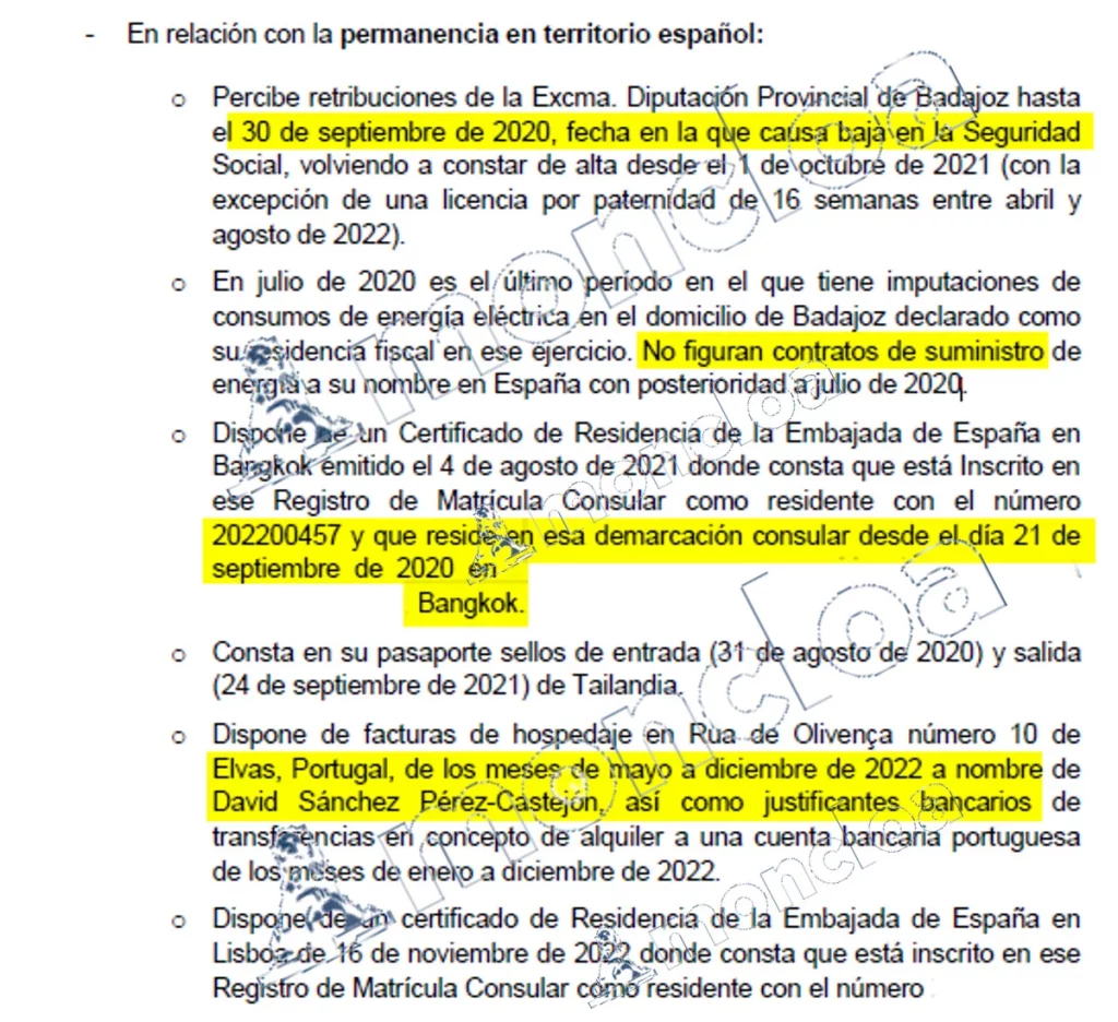 En el informe de defensa de la Agencia Tributaria, supuestamente realizado por el fisco pese a carecer de los distintivos diferenciales, el hermano de Pedro Sánchez entregó un «certificado de residencia de la embajada de España en Bangkok, emitido el 4 de agosto de 2021, donde consta que está Inscrito en ese Registro de Matrícula Consular como residente con el número 202200457 y que reside en esa demarcación consular desde el día 21 de septiembre de 2020 en 525/82 Rattanakosin View Mansion, Unit C12A Phra Pinklao RD, Bangkok».
