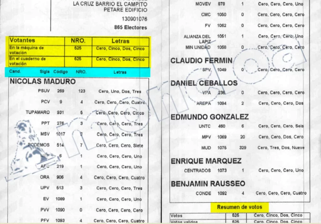 Cada acta es prácticamente imposible de falsificar ya que cada partido debe aportar su parte de la contraseña para poder hacer una copia en la máquina. Por este motivo, Maduro busca de forma incansable a los testigos y firmantes de cada acta, con el fin de mantener el fraude electoral, confeccionar unas nuevas y presentarlas. 20 días después, ni un papel ha dado ante el Tribunal Supremo de Justicia, que ha avalado no obstante la victoria de Maduro sin que haya habido un escrutinio total.