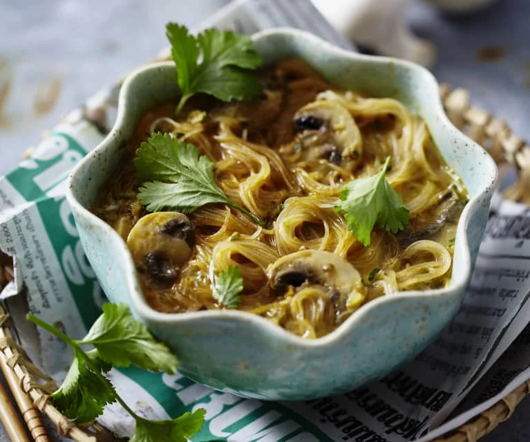 Esta sopa asiática se caracteriza por su equilibrio perfecto entre lo picante y lo cremoso, gracias a ingredientes como el jengibre fresco, el curry en polvo y la leche de coco. Los champiñones laminados y los fideos de arroz vermicelli añaden textura y sustancia al plato, haciendo que cada cucharada sea una experiencia única. Perfecta para cualquier época del año, esta sopa asiática te permitirá disfrutar de una explosión de sabores en cada bocado, mientras cuidas tu salud al optar por una versión libre de gluten.
