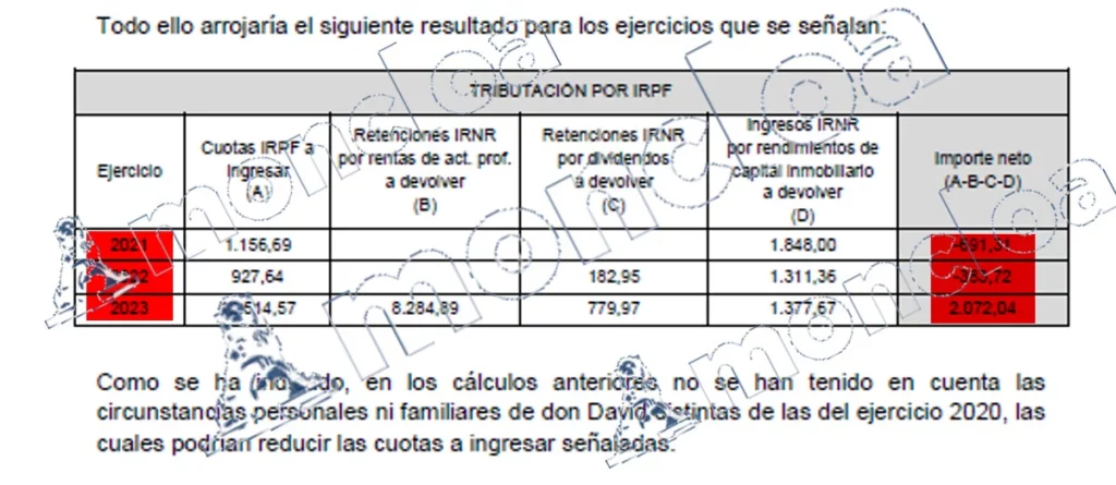 «Si Don David Sánchez Pérez-Castejón fuera residente fiscal en España, debería tributar en España por el IRPF por su renta mundial», afirma el escrito presentado. En este caso, «se han calculado las cuotas tributarias que resultarían de gravar por este impuesto los rendimientos que constan en las bases de datos de la Agencia Tributaria».