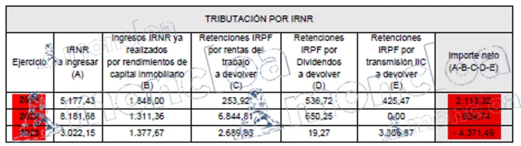 «Paralelamente, procedería la devolución de los ingresos efectuados en los ejercicios 2021, 2022 y 2023 por el IRNR en el modelo 210, así como de las retenciones soportadas por este impuesto en los ejercicios 2022 y 2023», apunta dicho informe.