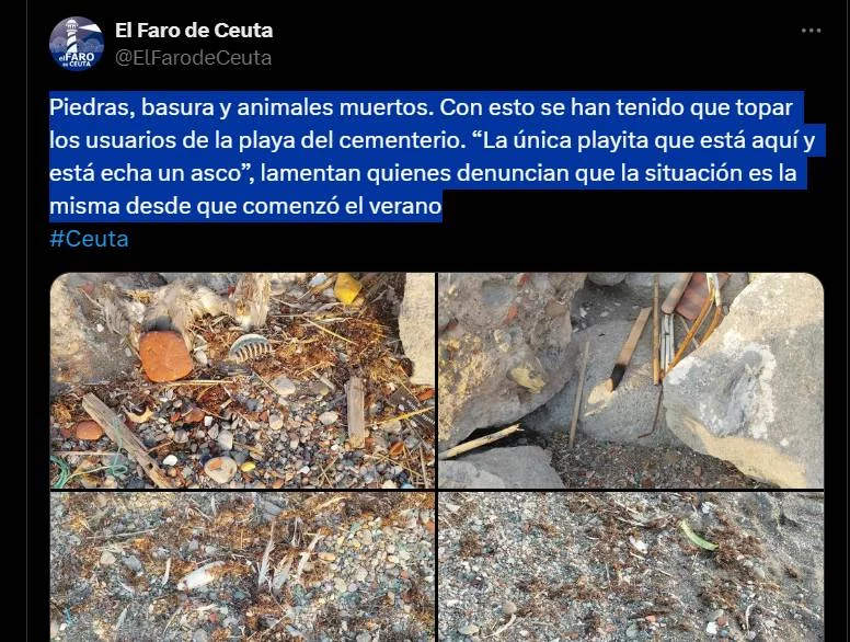La existencia de una plaga de garrapatas en la playa del Cementerio se explica por el derrumbe de un muro, en el que se acumuló gran cantidad de basura. Desde El Faro de Ceuta se hizo la denuncia pública sobre la situación, asegurando que la falta de higiene es la principal causa de la proliferación de estas especies. «Piedras, basura y animales muertos. Con esto se han tenido que topar los usuarios de la playa del cementerio», expuso el mencionado medio en su cuenta oficial de redes sociales.