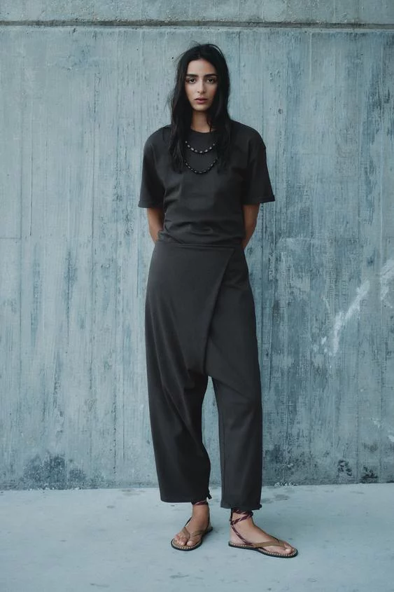 El primero es este conjunto dos piezas compuesto por camiseta y pantalón en hilatura de algodón. La camiseta está confeccionada en hilatura de algodón compacto y cuenta con escote pico cruzado. También sorprende por el cinturón en mismo tejido ajustable con lazadas y el efecto lavado. Este conjunto se completa con un pantalón confeccionado en hilatura de algodón compacto. Cuenta con tiro medio y cintura con elástico y con pierna ancha. Un conjunto de dos piezas perfecto para los primeros días del otoño por su estilo y corte.