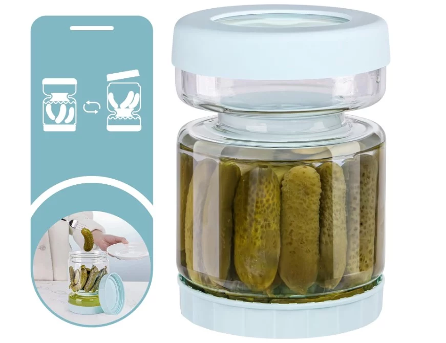 El tarro de pepinillos disponible en Amazon destaca por su diseño funcional que va más allá de un simple contenedor. Su capacidad de 1.5 litros y su boca ancha de 12 cm permiten una fácil manipulación, llenado y limpieza, lo que reduce las complicaciones a la hora de preparar y almacenar encurtidos. Además, cuenta con un sistema de doble compartimento que separa el líquido de los alimentos, garantizando que los pepinillos, jalapeños o cualquier otro encurtido se mantengan en óptimas condiciones sin mezclarse con su jugo.