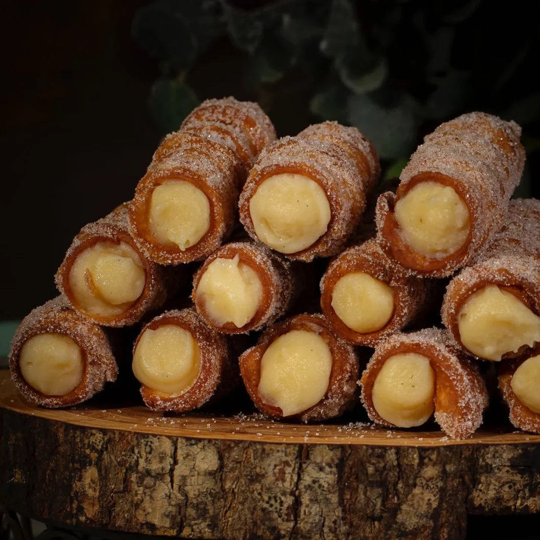 Rellena cada caña con la crema pastelera, usando una manga pastelera para que el proceso sea mucho más fácil y para asegurar que el relleno se distribuya de manera uniforme. La crema debe estar bien fría y firme para que no se derrame. Una vez rellenas, espolvorea las cañas con azúcar glas para un toque de dulzura adicional y una presentación atractiva.