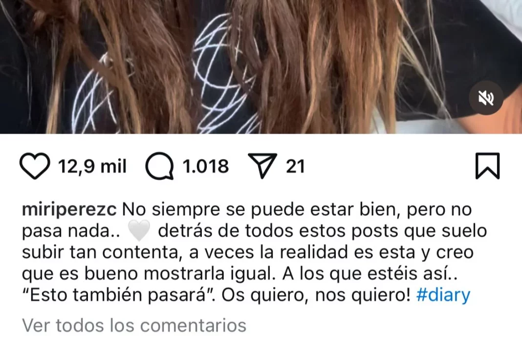 En su publicación, Miri Pérez-Cabrero cuenta que, aunque por lo regular comparte contenidos llenos de alegría, la realidad no siempre es tan perfecta como parece. «No siempre se puede estar bien, pero no pasa nada… detrás de todos estos posts que suelo subir tan contenta, a veces la realidad es esta y creo que es bueno mostrarla igual», afirmó la influencer.