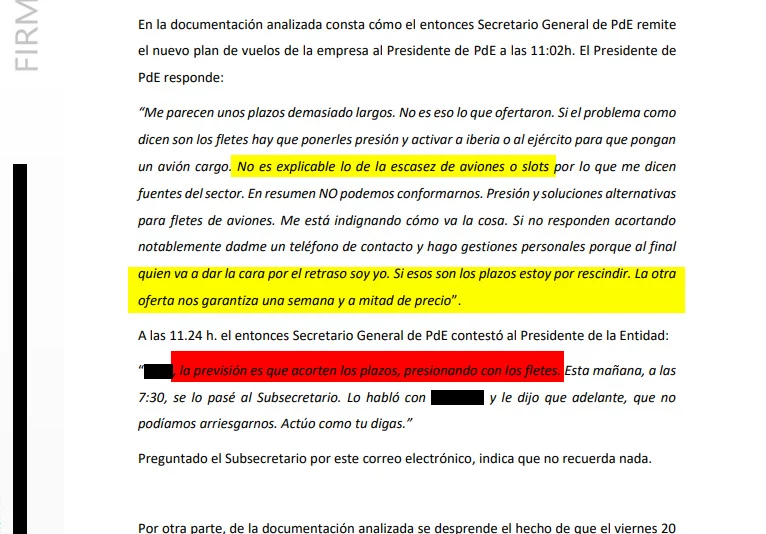 «No es explicable lo de la escasez de aviones o slots por lo que me dicen fuentes del sector. En resumen no podemos conformarnos. Presión y soluciones alternativas para fletes de aviones. Me está indignando cómo va la cosa», advirtió antes de amenazar con romper el contrato. «Si no responden acortando notablemente dadme un teléfono de contacto y hago gestiones personales porque al final quien va a dar la cara por el retraso soy yo. Si esos son los plazos estoy por rescindir», amenazó. «La otra oferta nos garantiza una semana y a mitad de precio», comentó respecto a la oferta llegada tras la publicación del BOE.