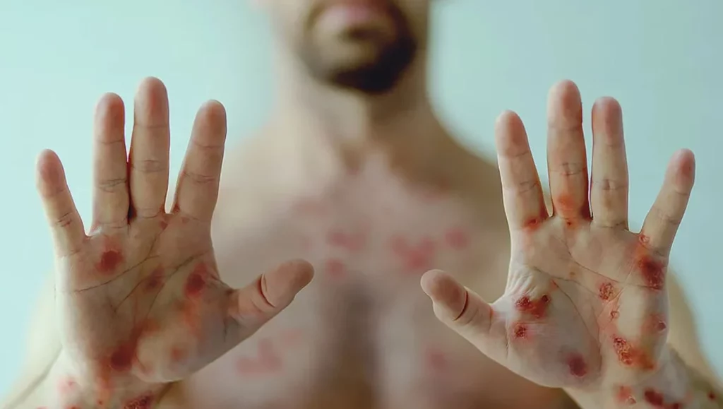 Por un lado, estas erupciones pasan por diversas etapas, pues inician siendo pequeñas manchas planas y llegan a hacer ampollas llenas de líquidos que eventualmente se secan y forman costras. Ademas, estas lesiones pueden aparecer en cualquier parte del cuerpo, incluyendo la cara, las palmas de las manos, la boca y los genitales. Asimismo, pueden ser dolorosas y estar acompañadas de otros síntomas como la fiebre, el dolor de cabeza, ganglios linfáticos inflamados, dolores musculares y fatiga constante.