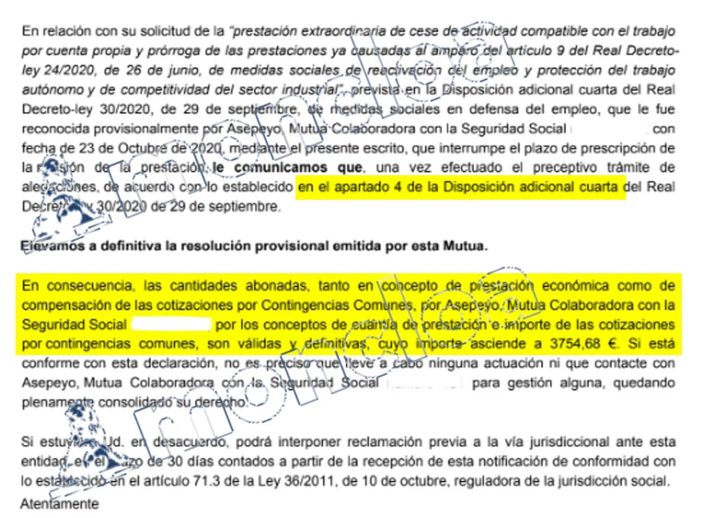 «Una vez efectuado el preceptivo trámite de alegaciones, de acuerdo con lo establecido en el apartado 4 de la Disposición adicional cuarta del Real Decreto-ley 30/2020 de 29 de septiembre. Elevamos a definitiva la resolución provisional emitida por esta Mutua», ha indicado la entidad al autónomo, exonerando al empleado por cuenta propia de devolver la ayuda.