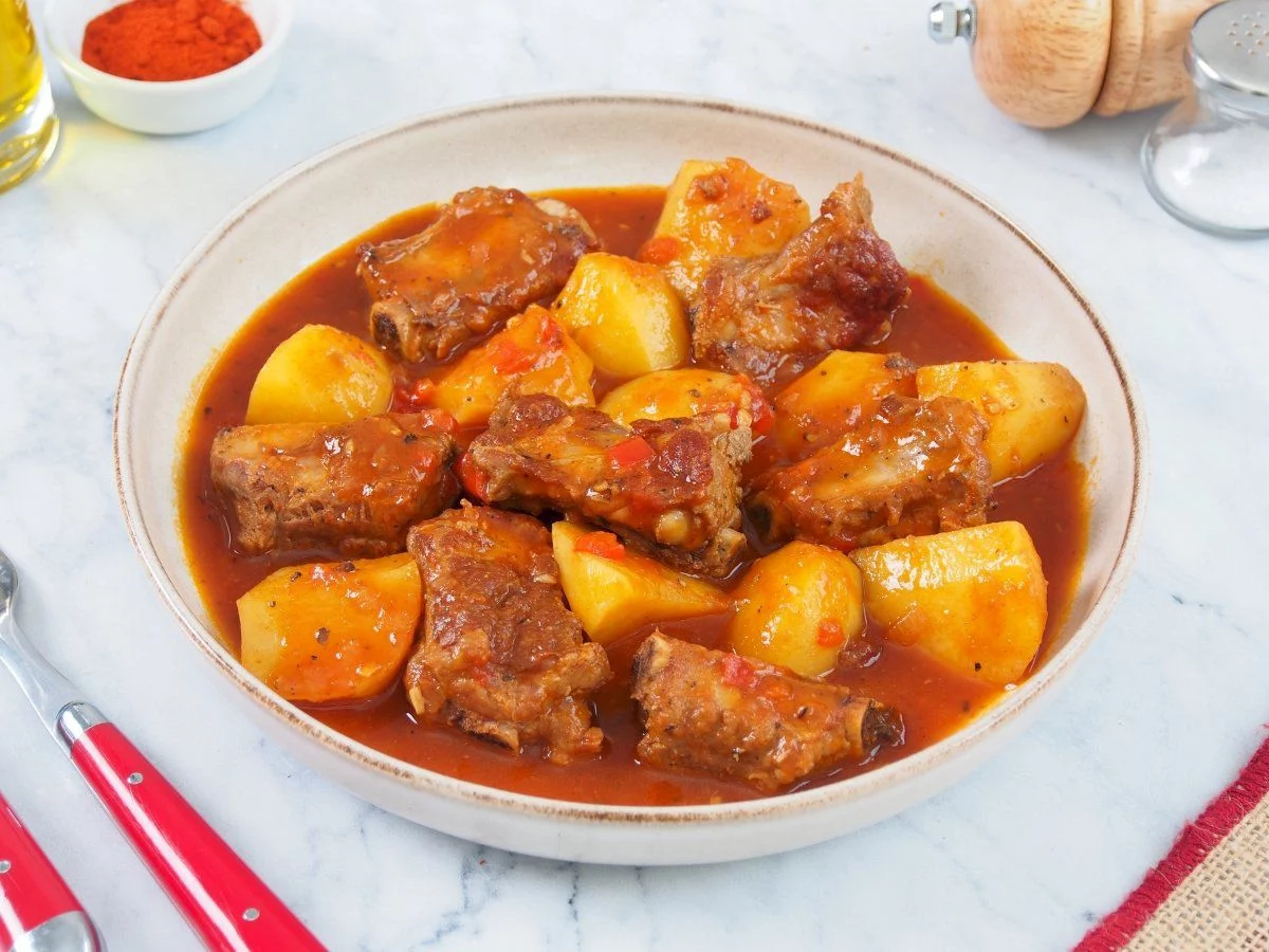 Acompaña las costillas con patatas, que se pelan y se cortan en cubos, y cebollas, que se pican finamente para aportar un sabor aromático. No pueden faltar los dientes de ajo, que se añaden picados o enteros, y una zanahoria, que aporta dulzura al guiso. Los tomates maduros, ya sea en puré o triturados, se incorporan para dar un toque de acidez y riqueza. El caldo de carne, el laurel, y el pimentón completan el perfil de sabor, junto con aceite de oliva, sal y pimienta al gusto.