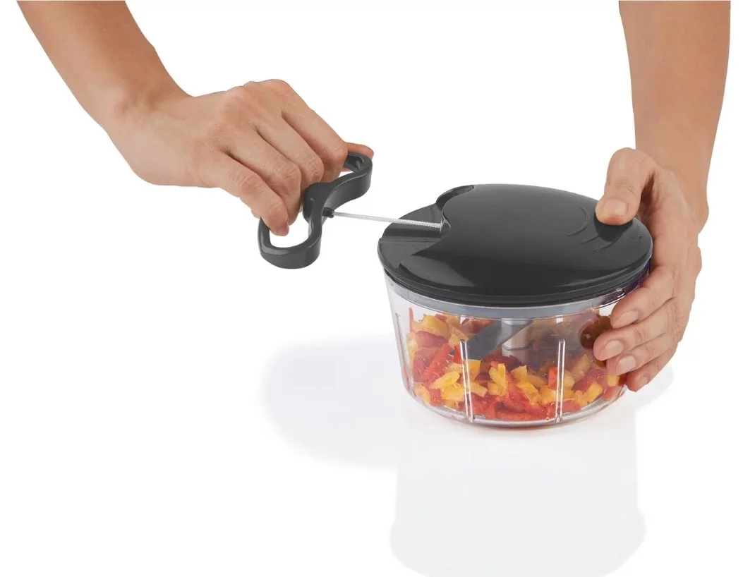Este aparato destaca por su diseño compacto y funcional. Con dimensiones aproximadas de 13 cm de diámetro y 9,4 cm de altura, la picadora manual es lo suficientemente pequeña como para guardarla en cualquier espacio de la cocina, pero a la vez tiene capacidad suficiente para procesar hasta 650 ml de alimentos. Sus cuchillas de acero inoxidable, sumamente afiladas, garantizan un corte preciso y eficiente en pocos segundos.