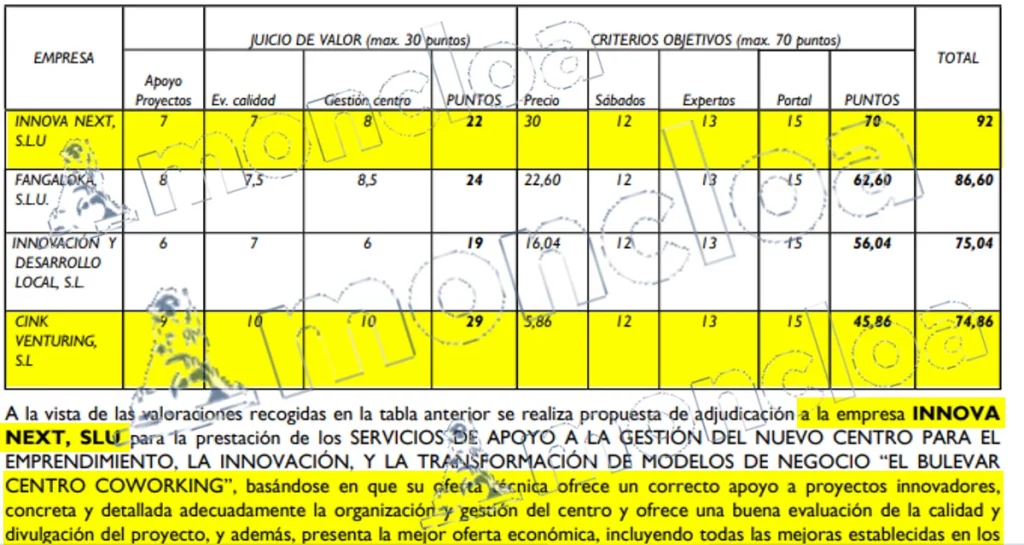 Además, el informe indica que también ofreció «una buena definición de los servicios de innovación y colaboración entre pymes, una adecuada gestión y dinamización del espacio coworking, un buen plan de comunicación y difusión, así como un correcto seguimiento y sistema de evalución, y que además, presenta la mejor oferta económica, incluyendo todas las mejoras establecidas en los criterios objetivos, obteniendo por tanto, la máxima puntuación en la licitación»