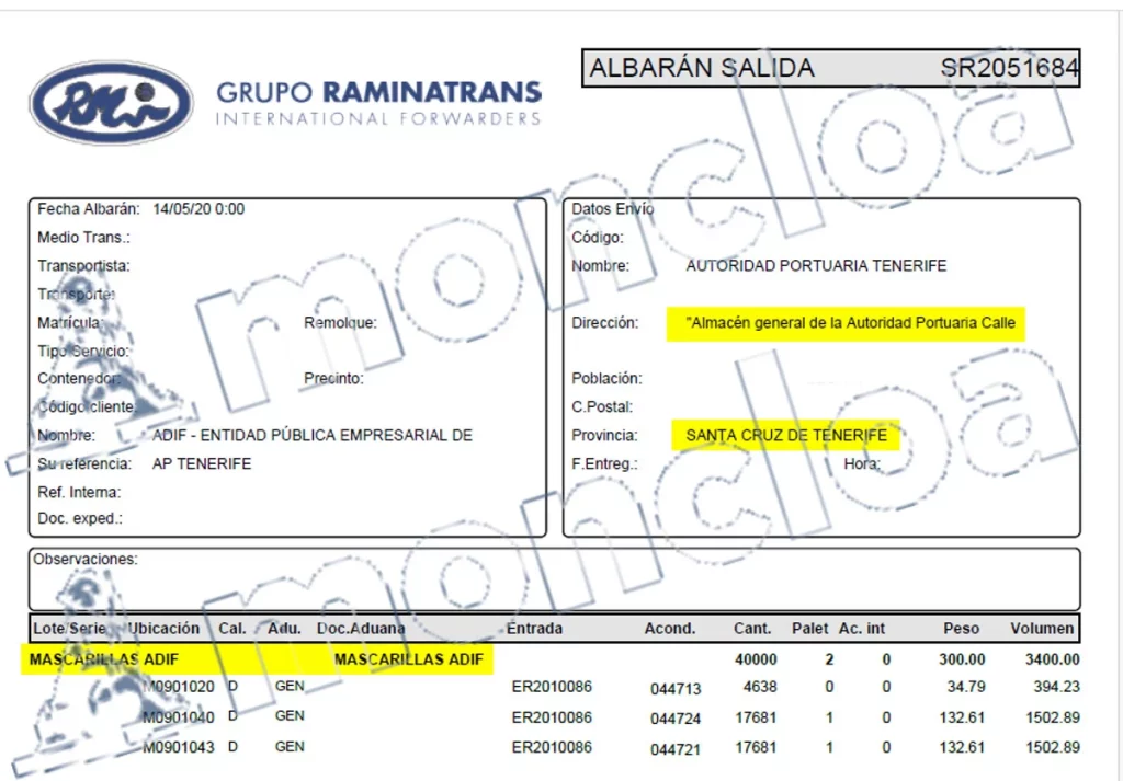 En Puerto Seco Coslada, más de lo mismo. «Envío teórico de 500 uds y dicen recibir 480 uds». «No hay ninguna reserva en el albarán de entrega.. Es la primera noticia que tenemos de esta falta. Matemáticamente la diferencia es posible (igual que en el caso anterior) ya que las mascarillas iban en bolsas de 20 uds. Podría ser un error de marcaje de la caja o un ‘robo’ en el transporte o en el lugar de entrega. Vamos a comunicar la incidencia al seguro por si acaso, aunque nos encontraremos con el problema de que el albarán de entrega está firmado sin reservas».
