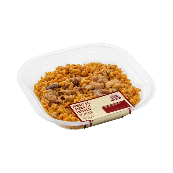 Otro de los productos preparados que pueden ser también una buena opción cuando no tenemos tiempo suficiente para las comidas y las cenas. El arroz de secreto ibérico con setas Hacendado está elaborado con caldo, champiñones, secreto de cerdo ibérico, arroz, tomate frito y extracto de carne entre sus ingredientes principales.