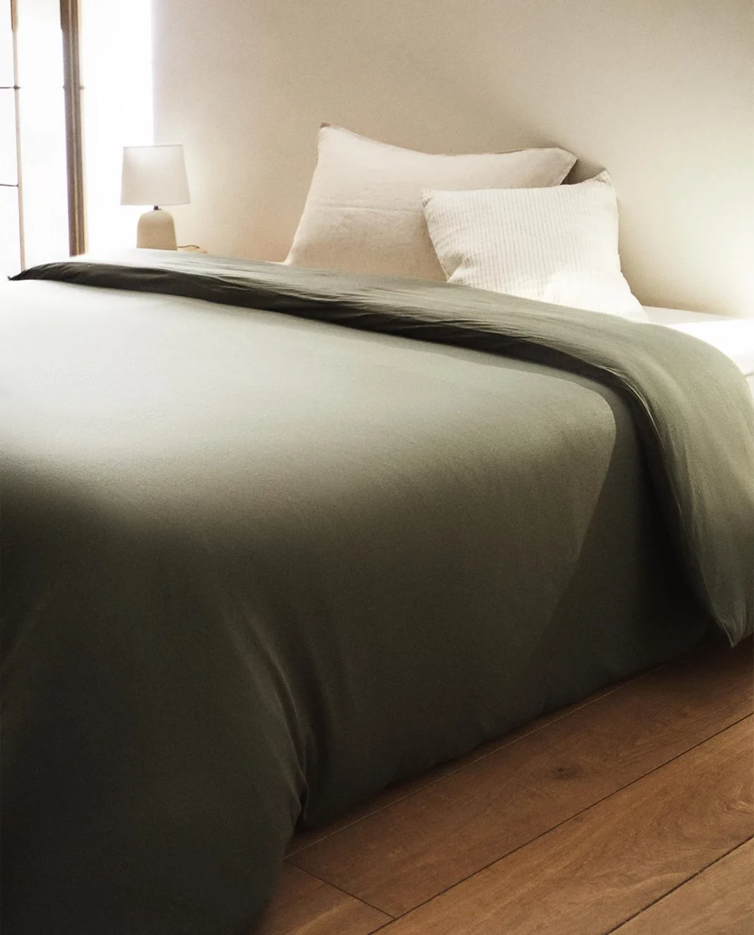 Esta cómoda funda nórdica está confeccionada en algodón jersey y diseño liso y cuenta con un cierre con botones ocultos en la parte inferior. Tiene un gramaje de 140 g/m y un diseño agradable y vistoso que se adapta a cualquier estilo decorativo. Una funda nórdica confeccionada en algodón jersey calentita y gustosa de Zara Home que se puede comprar en el tono de moda para este otoño: el color verde oscuro que está entre el caqui y el oliva. También se puede encontrar en color crudo que se puede combinar con la decoración de cualquier decoración.