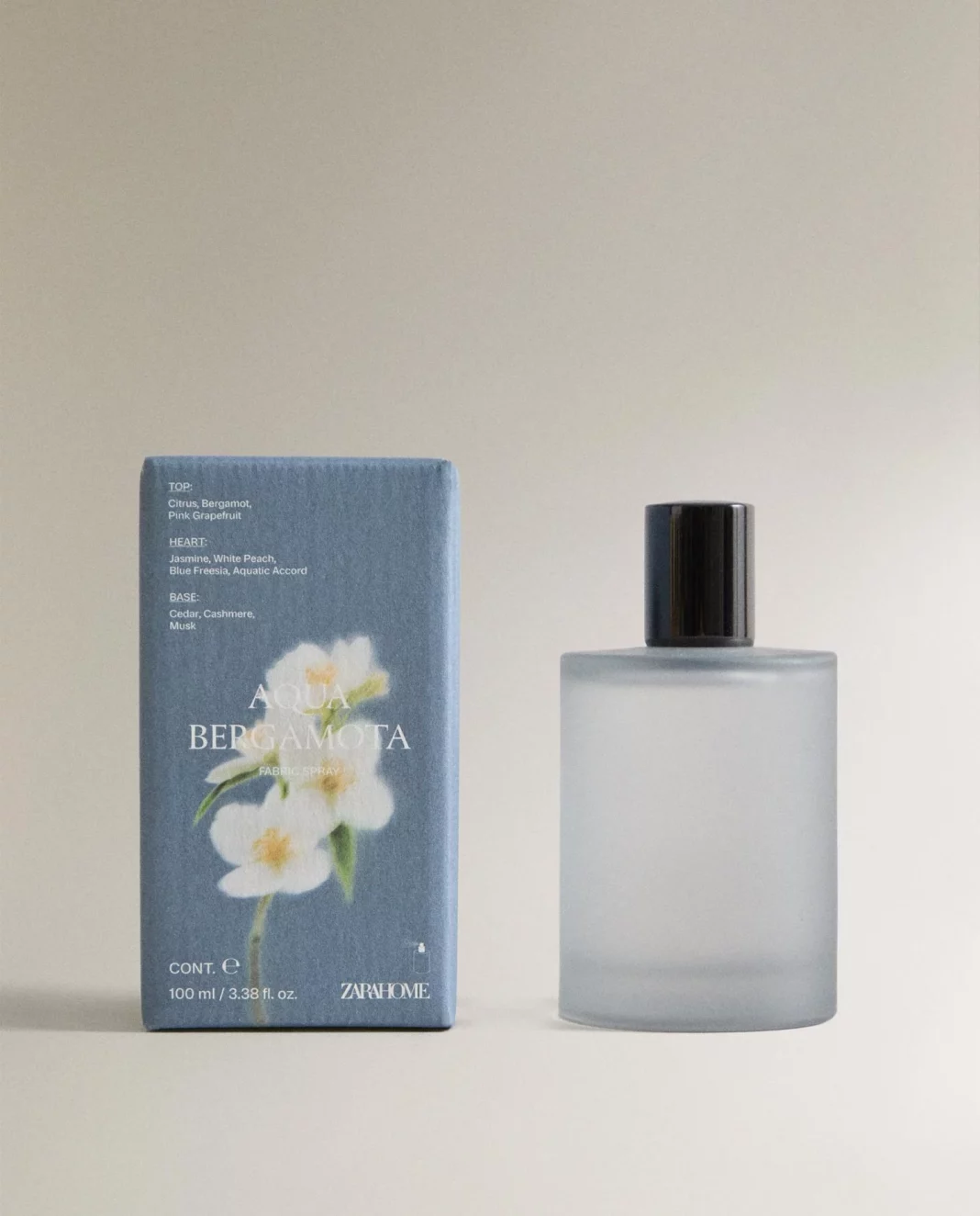 Por último hemos elegido este ambientador textil en spray Aqua Bergamota que tiene un aroma fresco que transporta al mediterráneo. Su formulación libre de alcohol permite su uso en cualquier tejido sin dañarlo. Este ambientador Aqua Bergamota cuenta, según la web de Zara Home, «con una fragancia vigorizante introducida por una infusión chispeante de bergamota y pomelo rosa, suavemente mezclada con la cremosidad del melocotón blanco y un delicado ramo floral de jazmín y fresia azul, sobre un fondo amaderado, suavemente moldeado por cachemira y almizcles blancos».
