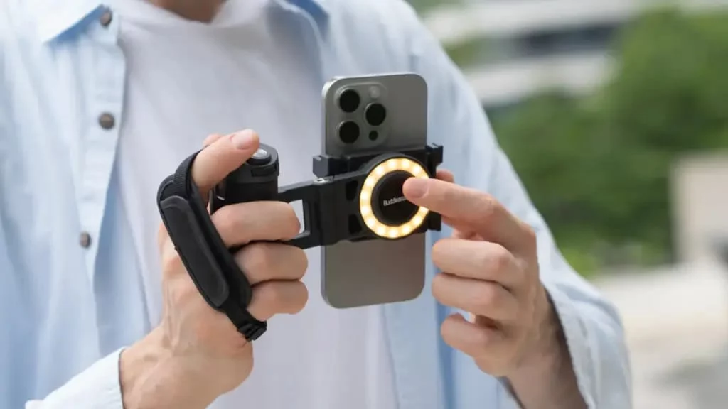 Además, hay otra rueda en la parte frontal de la empuñadura se usa para modificarse entre funciones de la cámara del dispositivo inteligente, es decir, pasar de realizar fotografías a grabar vídeos, incluso gestionar el zoom digital. Como en las cámaras fotográficas, el botón del obturador estilo DSLR se ubica en la parte superior de la empuñadura. Se puede tocar para tomar fotografías o para empezar y detener la grabación.