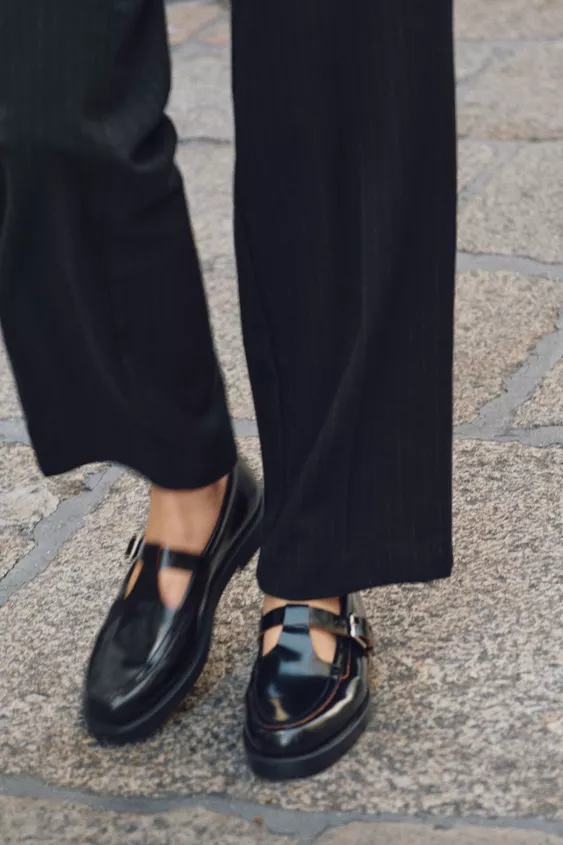 El primero en el que nos hemos fijado es en este zapato plano tipo mocasín en piel en tono negro que cuenta con detalle de tira en la parte delantera y acabado en punta redonda. Cuenta con una altura de la suela de 3 cm. Unos zapatos muy otoñales que combinan con todo y que nos recuerdan a los clásicos mocasines y las modernas Mary Janes. Unos zapatos moderno, elegantes y muy cómodos. Estos zapatos negros se pueden encontrar en la web de Zara en tallas de la 35 a la 42 y a un precio de 55,95 euros.