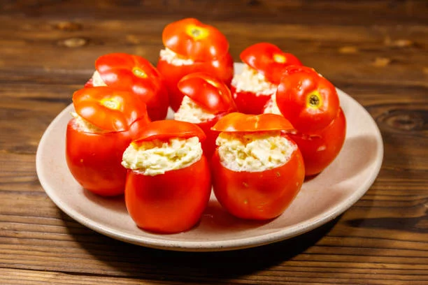 Para comenzar, necesitarás solo cuatro tomates grandes y unos cuantos ingredientes básicos. Lo primero es cortar los tomates por la mitad y extraer su pulpa, que será parte esencial del relleno. Este paso es fundamental, ya que convierte a los tomates en perfectos cuencos que, al ser rellenados, conservarán todos los sabores frescos y vibrantes. Mientras tanto, en un bol, mezcla la pulpa de los tomates con 200 gramos de queso mozzarella y otros 200 gramos de jamón ahumado, ambos cortados en pequeños dados, asegurándote de que todos los ingredientes estén bien combinados.